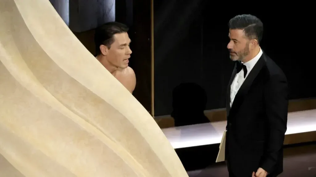 في مفاجأة صدمت الجمهور الحاضر لحفل توزيع جوائز الأوسكار، أطل المصارع الأميركي الشهير جون سينا على مختلف نجوم الفن والأزياء والدراما والموسيقى، عاريًا تمامًا خلال تسليم جائزة أفضل تصميم أزياء.
