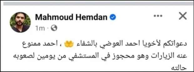 حيث كتب محمود حمدان مؤلف مسلسل أحمد العوضي الجديد “حق عرب” منشور على حسابه بموقع فيسبوك جاء فيه: “دعواتكم لأخويا أحمد العوضي بالشفاء، أحمد ممنوع عنه الزيارات، وهو محجوز في المستشفى بقاله يومين لصعوبة حالته”، قبل أن يحذف المنشور بعد دقائق من كتابته.