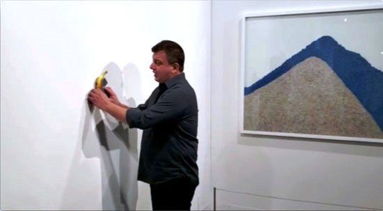 تمّ إرسال مسؤولي المعرض إلى سوبّر ماركت محلّي لشراء موزة وتثبيتها على الجدار وفقاً لتعليماته الدّقيقة؛ على ارتفاع حوالي 68 بوصة عن الأرض وبزاوية 37 درجة.
