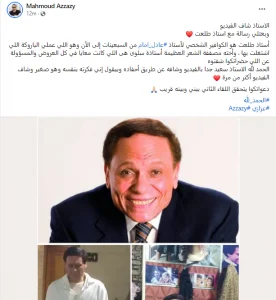 الزعيم عادل إمام..كشف الممثل محمود العزازي عن أول تعليق تلقاه من الزعيم عادل إمام بشأن تقليده لشخصيته، حيث نشر العزازي صورًا من الفيديو على حسابه الشخصي بموقع فيس بوك.