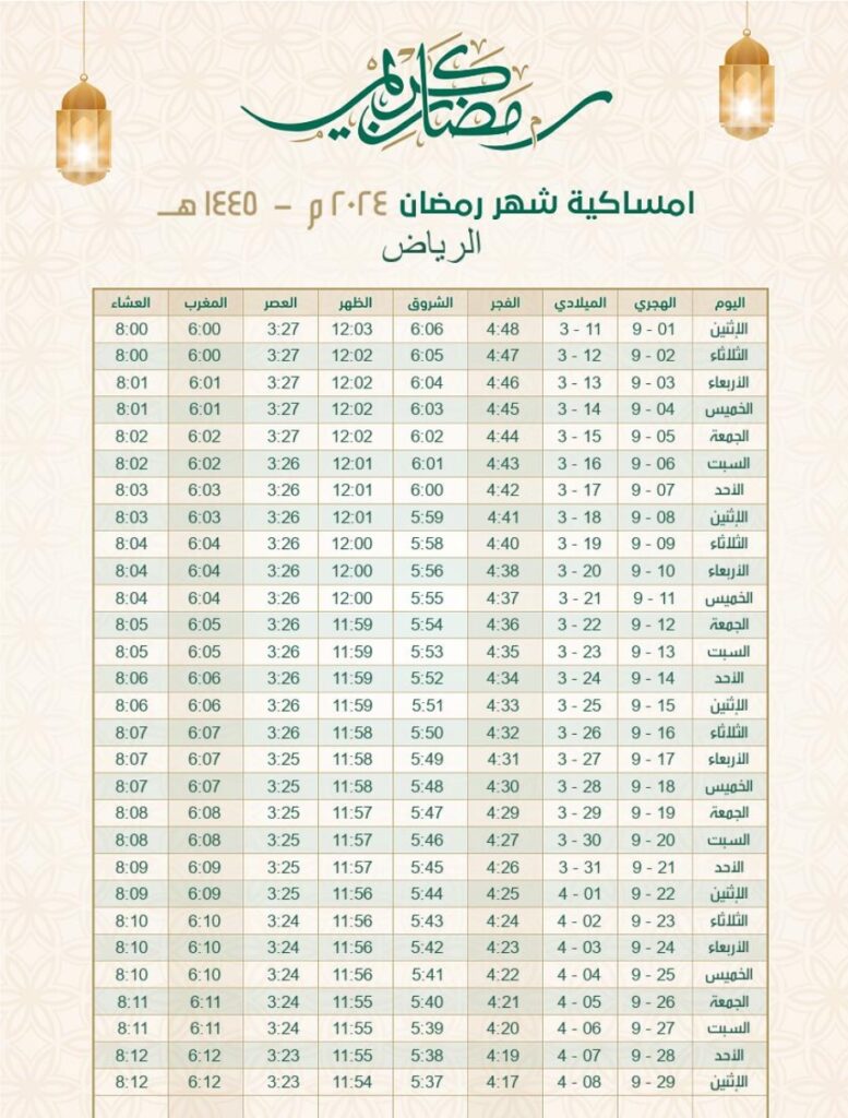 السعودية تبدأ أول يوم في شهر رمضان من فجر الاثنين الموافق 11 مارس الموافق، مدة ساعات الصوم 13 ساعة و18 دقيقة، السحور 2:23، إمساك 4:23، الفجر 4:43، صلاة المغرب 6:01.