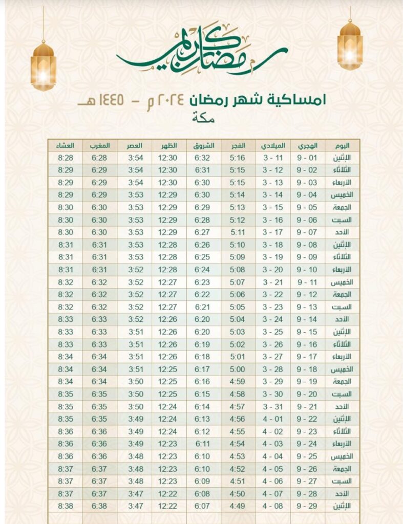 مواعيد الصلاة ومواقيت الإفطار والسحور في السعودية رمضان 2024