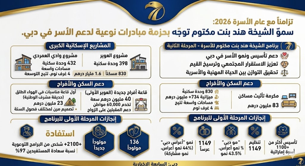 تزامناً مع عام الأسرة 2026، وجهت حرم صاحب السموّ الشيخ محمد بن راشد آل مكتوم نائب رئيس الدولة رئيس مجلس الوزراء حاكم دبي “رعاه الله”، سموّ الشيخة هند بنت مكتوم بن جمعة آل مكتوم، بحزمة مبادرات نوعية لتعزيز الاستقرار المجتمعي وتمكين الأسر في دبي، وذلك ضمن المرحلة الثانية من “برنامج الشيخة هند بنت مكتوم للأسرة”، الذي يعد مبادرة شاملة تهدف إلى دعم تأسيس ونمو الأسر في دبي، وترسيخ القيم المجتمعية، وتعزيز جودة حياة الأسر، إضافة إلى توفير بيئة اجتماعية محفزة لها، وتحقيق التوازن بين الحياة المهنية والأسرية.