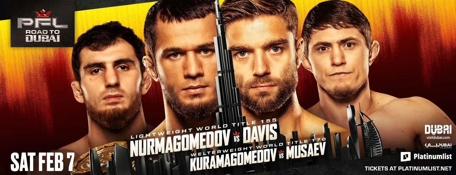 تعود منافسات فنون القتال المختلطة إلى دبي من جديد، مع النسخة المقبلة من سلسلة “الطريق إلى دبي – سلسلة الأبطال”، التي ستقام في 7 فبراير 2026 في قاعة كوكا كولا أرينا، وتشهد مواجهة من العيار الثقيل بين بطل العالم في الوزن الخفيف عثمان نورماغوميدوف وخصمه البارز ألفي ديفيس.