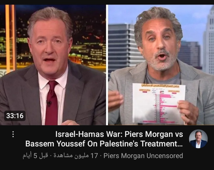 أكثر من 15 مليون مشاهدة خلال يومين، كان عدد مشاهدات لقاء باسم يوسف مع بيرس مورغان، والتي ناقشا فيها الأحداث الحالية في فلسطين وما تشهده غزة.