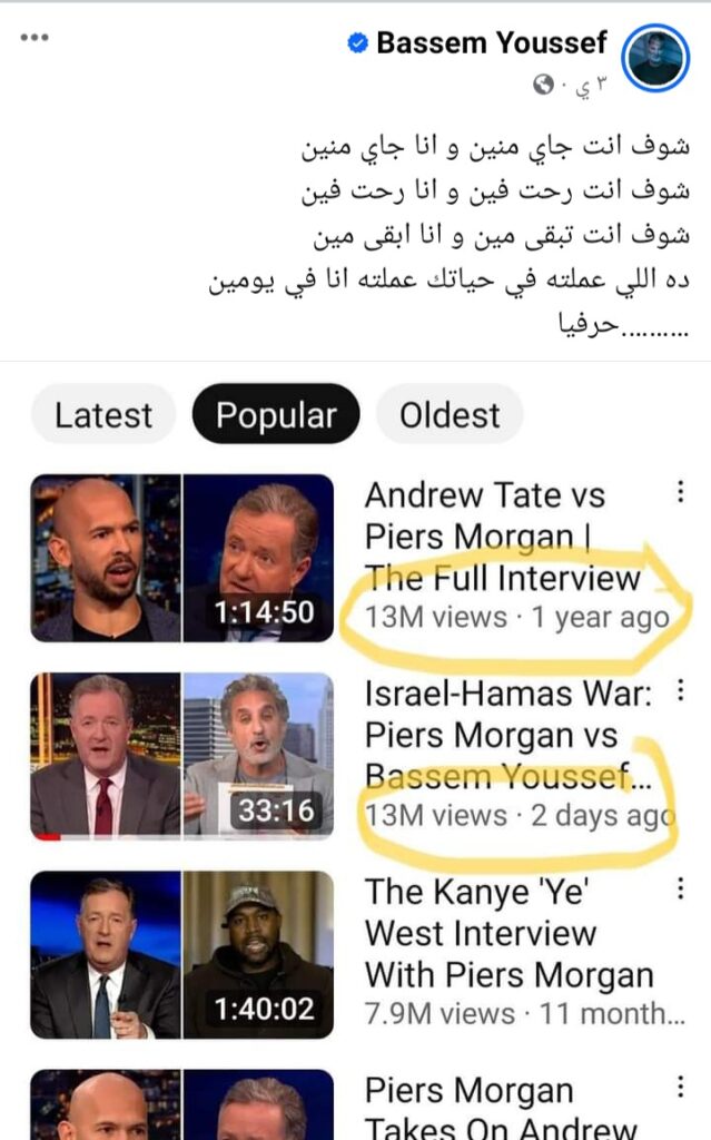 ونشر مورغان تغريدة على حسابه الرسمي في موقع إكس وكتب فيها عدد المشاهدات التي وصلت لها مقابلته مع باسم يوسف وأضاف: “المقابلة الأكثر مشاهدة التي قمت بها على الإطلاق”.