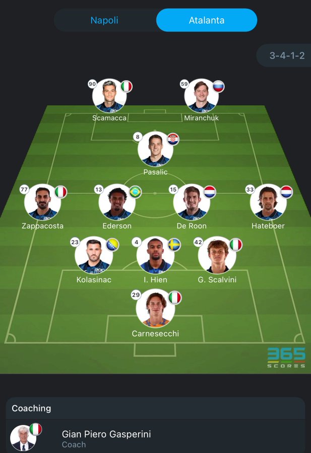 تضم تشكيلة لاعبي فريق أتلانتا لمواجهة فريق نابولي في الجولة الـ 30 من منافسات الدوري الإيطالي كلا من :-