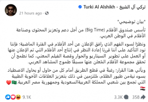 ومن خلال بيان توضيحي، شاركه آل الشيخ عبر حسابه الرسمي على منصة الفيسبوك، كشف فيه قراره في إعاد النظر بإنتاج الفيلم، حيث قال: “تأسس صندوق الأفلام (Big Time) من أجل دعم وتعزيز المحتوى وصناعة الأفلام في الوطن العربي”.