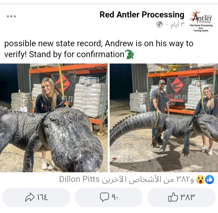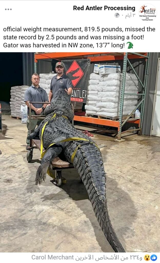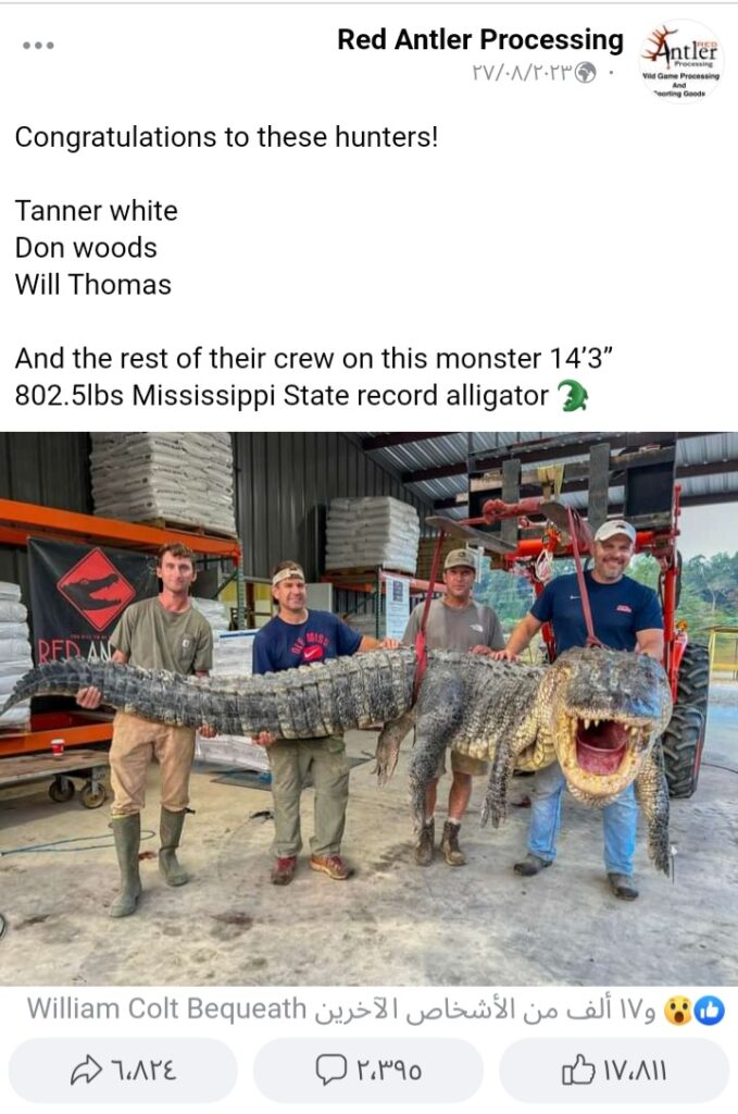 وأكدت إدارة الحياة البرية ومصايد الأسماك والمتنزهات في ميسيسيبي في منشور على وسائل التواصل الاجتماعي أن طول تمساح يبلغ 14 قدماً وحطم بذلك الرقم القياسي للولاية “لأطول تمساح يتم اصطياده”.