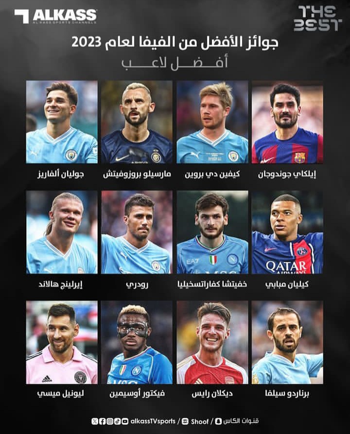 والجورجي خفيتشا كفاراتسخيليا (نابولي) والفرنسي كيليان مبابي (باريس سان جيرمان) والأرجنتيني ليونيل ميسي (باريس سان جيرمان/إنتر ميامي) والنيجيري فيكتور أوسيمين (نابولي) والإنجليزي ديكلان رايس (وست هام يونايتد/آرسنال) والبرتغالي برناردو سيلفا (مانشستر سيتي).