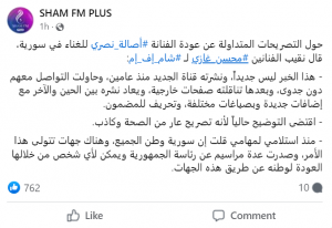 ونفى نقيب الفنانين محسن غازي لإذاعة شام إف إم صحة هذا الخبر، مبيناً أنه ليس بخبر جديد، ونشرته قناة الجديد منذ عامين، لافتاً إلى أنه حاول التواصل مع القناة لينفوا الخبر لكن دون جدوى، وبعدها تناقلته صفحات خارجية، ويعاد نشره بين الحين والآخر مع إضافات جديدة وبصياغات مختلفة، وتحريف للمضمون.