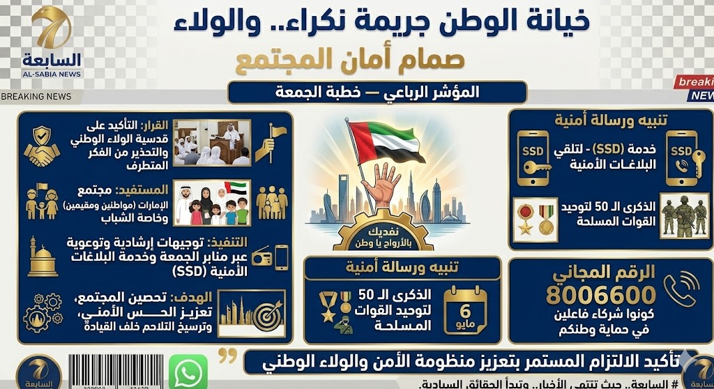 تمثل هذه الخطبة “مانيفستو” وطنياً يعيد تعريف المواطنة الصالحة بربطها بالولاء المطلق للدولة الوطنية، وترسيخ فكرة أن الأمن مسؤولية جماعية. إن التشديد على جريمة “خيانة الوطن” في هذا التوقيت يعزز المناعة المجتمعية ضد الاختراقات الفكرية، ويجدد العهد السيادي بأن الإمارات ستبقى حصناً منيعاً لا يقبل القسمة على الولاءات العابرة للحدود.