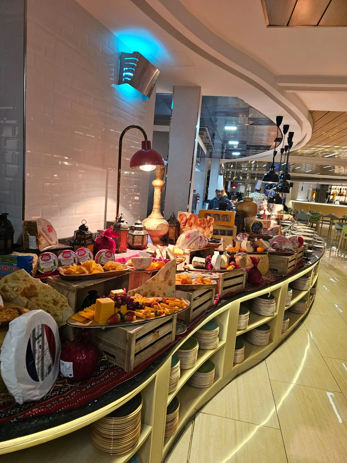 على الفور، تلاحظ بوفيه فخم ومتنوع، أكبر القوالب الرمضانية للحلويات تتلألأ على الطاولات، وأطباق محضرة بعناية فائقة تجمع بين المطبخ الإماراتي، العربي، المغربي، الهندي، الآسيوي والعالمي. كل طبق يبدو وكأنه لوحة فنية، وكل رشة من التوابل تروي قصة، كل نكهة تأخذك إلى تجربة مختلفة عن أي إفطار رمضاني آخر.