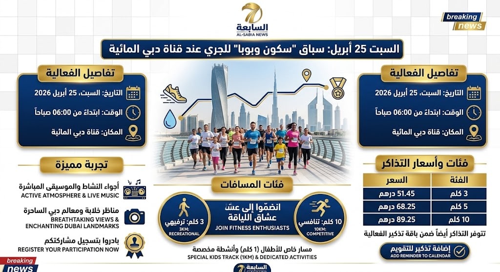 تنطلق فعالية سباق سكون وبوبا العالمية للجري في دبي يوم 25 أبريل على امتداد قناة دبي المائية، مقدّمة تجربة رياضية متكاملة تعزز نمط الحياة الصحي والمشاركة المجتمعية.
