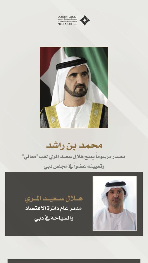 بالإضافة إلى تشكيل مجلس دبي، تم أيضًا إصدار مرسوم آخر (رقم 36 لعام 2024) يمنح هلال سعيد سالم خلفان المري، الذي يشغل منصب مدير عام دائرة الاقتصاد والسياحة في دبي وهو عضو في مجلس دبي، لقب “معالي”، مما يعكس تقدير القيادة الإماراتية لجهوده ومساهماته في التطوير والنمو الاقتصادي والسياحي في الإمارة.