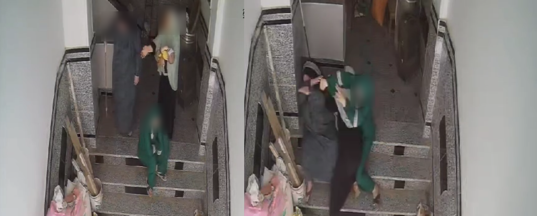 ويظهر الفيديو، زوجة تضرب حماتها، في ظل غياب الزوج الذي يعمل في إحدي الدول العربية، حيث سجلت كاميرات المراقبة داخل المنزل، واقعة الاعتداء كاملة.