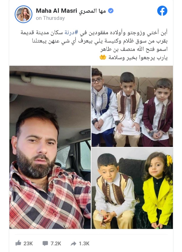 وأكّدت “المصري”، أن شقيقتها وزوجها بخير، حيث كانا في مدينة بنغازي لحظة وقوع الإعصار، الذي حال دون عودتهما إلى مدينة درنة، التي يعيشان فيها برفقة نجلهما المفقود.