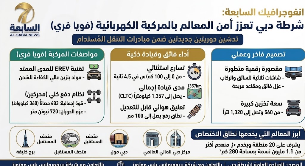 أعلنت شرطة دبي إضافة سيارة “فوياه فري” الكهربائية الفاخرة إلى أسطولها بالتعاون مع “بيرفورمانس بلس موتورز”. وتعتمد السيارة على تقنية المدى الطويل (EREV) التي تجمع بين الطاقة الكهربائية ومولد وقود داعم.