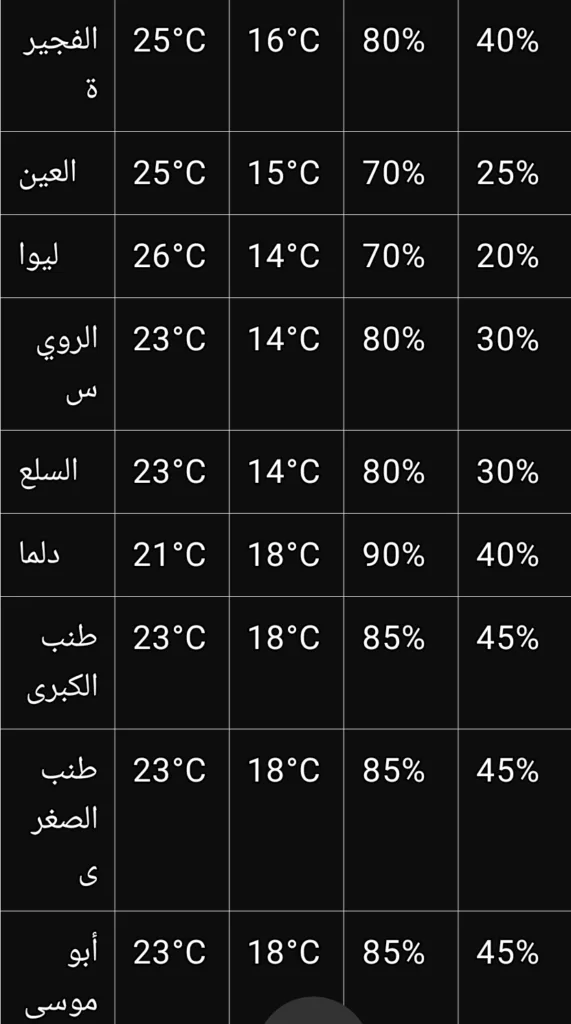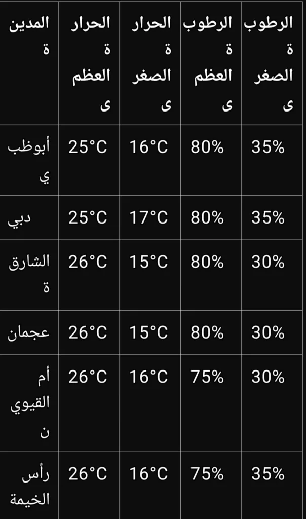 وفيما يلي جدول بأهم التوقعات لدرجات الحرارة والرطوبة في الإمارات يوم غد: