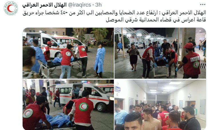 بدوره، أعلن الهلال الأحمر العراقي، عن وقوع أكثر من 450 ضحية ما بين قتيل وجريح، في حريق قاعة أفراح في قضاء الحمدانية بمحافظة نينوى بالعاصمة العراقية بغداد.