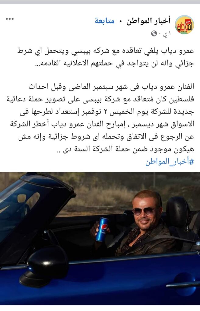 وأثار المنشور المتداول على مواقع التواصل الاجتماعي جدلاً واسعاً حول فسخ الفنان عمرو دياب تعاقده مع إحدى شركات المشروبات  الغازية الكبرى، ضمن حملة المقاطعة التي أطلقها رواد السوشيال ميديا لبعض العلامات التجارية.