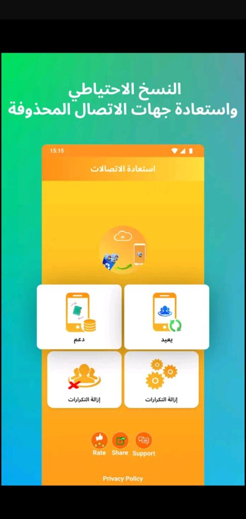 لذلك فهذا التطبيق يمكنك من استرجاعها بدون أي مشاكل، فبعد تثبيت التطبيق على هاتفك سوف تجد عدة خيارات فيها وأول خيار هو إمكانية عمل نسخ احتياطية لأرقام الهاتف او القيام بنقلها إلى هاتف آخر بدون أي مشاكل مع إمكانية استرجاع ما هو محذوف.