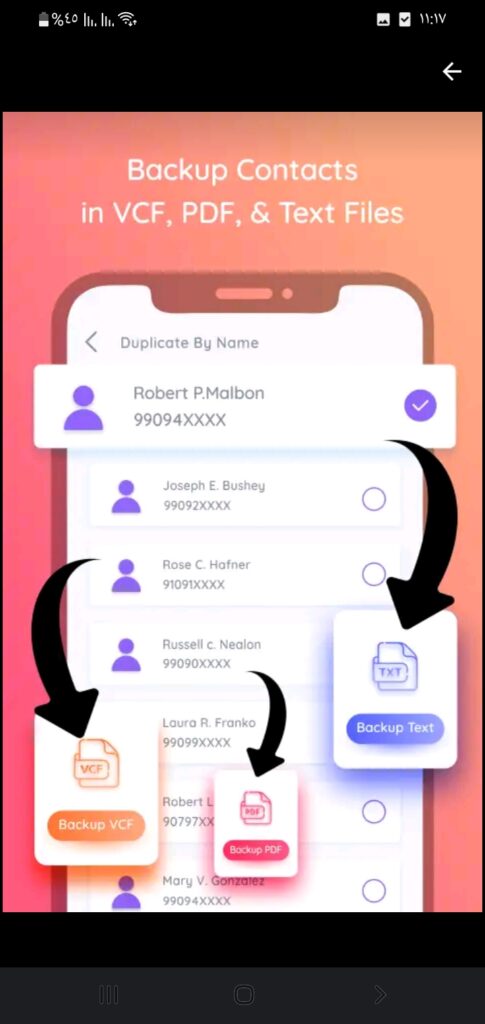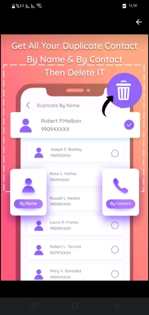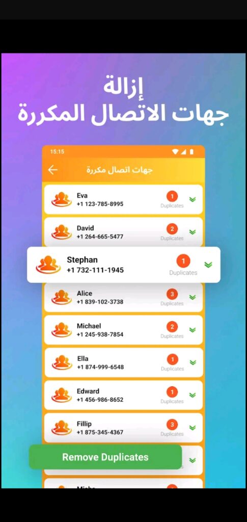 بالإضافة إلى أنه إذا كان دفتر الأرقام الخاص بك في هاتفك يتوفر على العديد من جهات الاتصال المكررة..؟ فهو يقوم يإزالة جميع جهات الاتصال المكررة من هاتفك والحفاظ على دفتر العناوين نظيفًا، كل ما عليك فعله هو اختيار ميزة المزيل المكرر من شاشة التطبيق وسيقوم بفحص هاتفك وحذف جميع جهات الاتصال المكررة بسرعة.