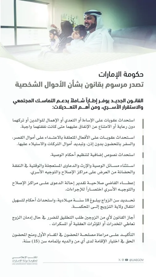 قانون الأحوال الشخصية.. في خطوة هامة نحو تعزيز استقرار الأسرة وحماية حقوق الأفراد، أصدرت حكومة دولة الإمارات مرسومًا بقانون الأحوال الشخصية الجديد لعام 2025، الذي يتضمن تغييرات جوهرية تهدف إلى مواكبة التحولات الاجتماعية والقانونية في الدولة.