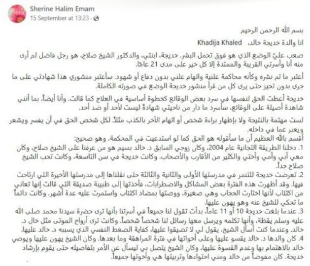 وقالت شيرين والدة خديجة في منشور عبر فيسبوك (حذفته لاحقًا): “أواجه وضعًا صعبًا يفوق تحمل البشر، ابنتي تتهم الشيخ صلاح، الذي لم ترى منه إلا الخير على مدار 21 عامًا”.