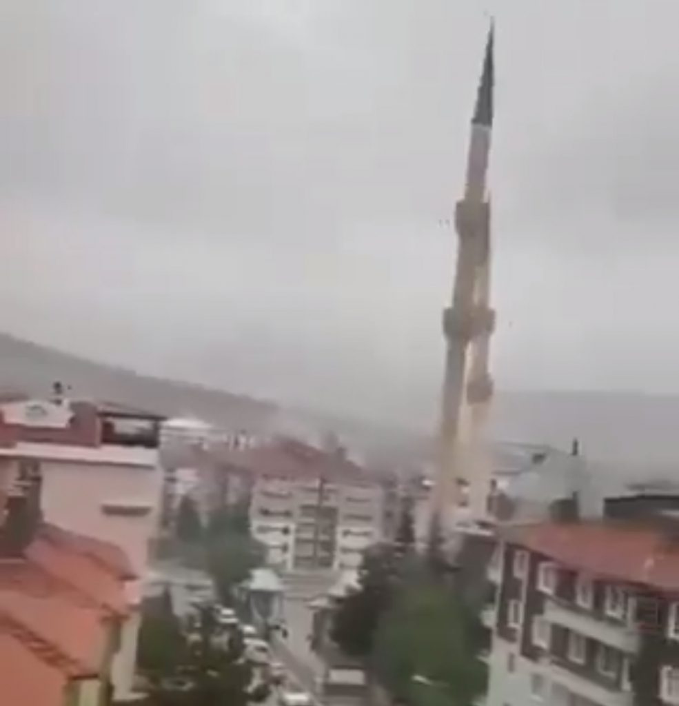مئذنة تتهاوى وتسقط بسبب الرياح عاصفة قوية في تركيا.. رياح قوية اجتاحت مدينة تشانكيري شرق أنقرة بتركيا، أسقطت الأشجار وسحبت الخزائن والمتعلقات وحاويات القمامة خارج أماكن العمل، وحطمت نوافذ بعض الشقق، كما تسببت في إسقاط مئذنة مسجد بادمليك في منطقة عبد الخالق رندا، شرق أنقرة بتركيا.