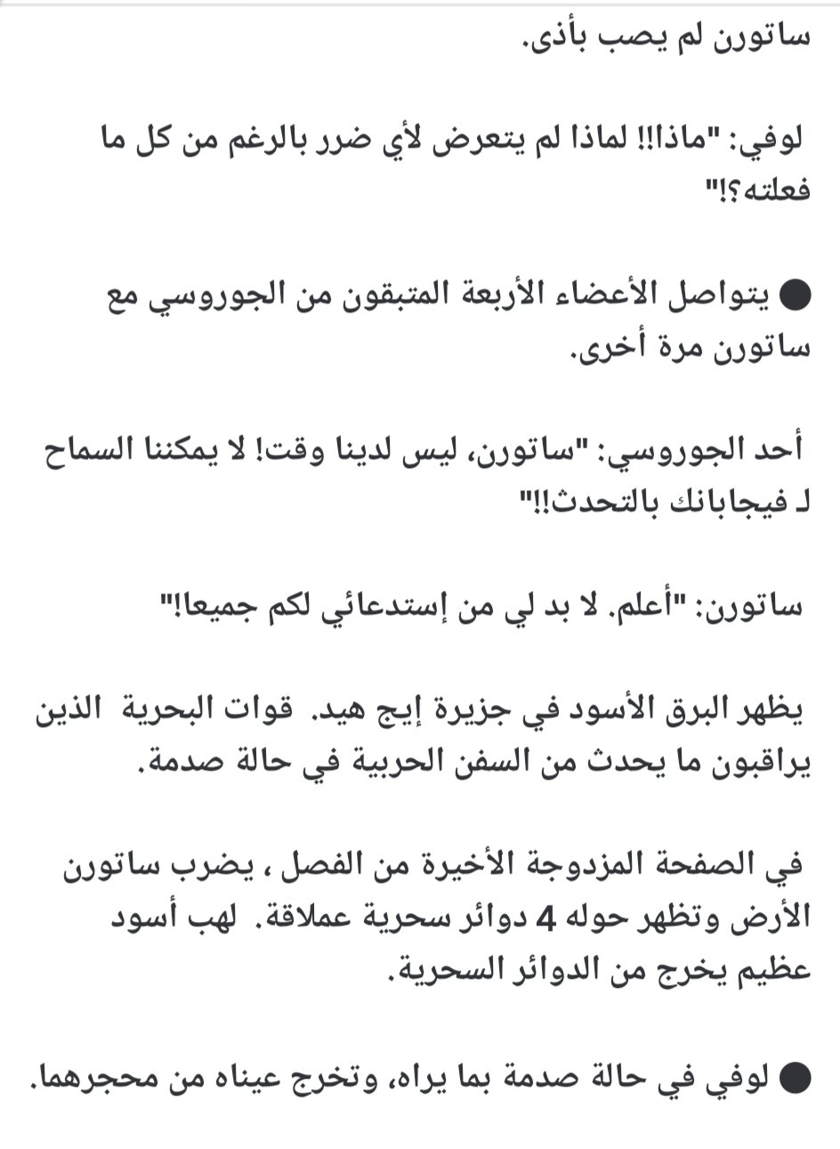 وحسب التسريبات، سيتم الكشف عن اسم المملكة القديمة، كما ستحدث معركة كبيرة بين لوفي وساتورن وكيزارو، حيث سيقوم لوفي باستخدام تقنية حديثة Dawn Cymbals.