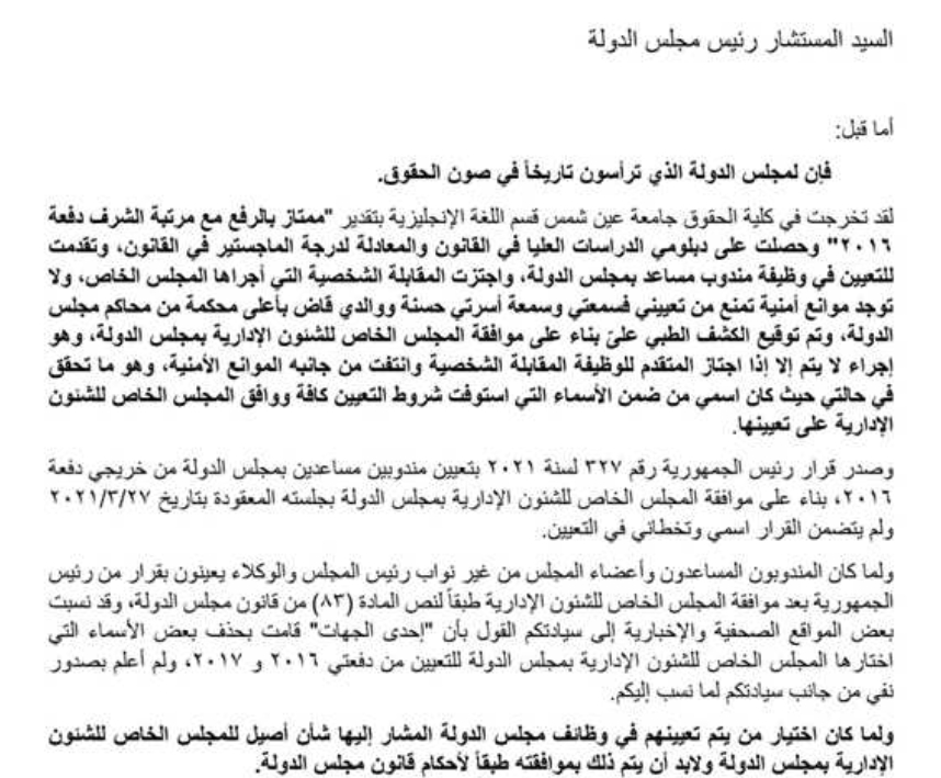 وقال في دعواه إنه حصل على ليسانس الحقوق شعبة اللغة الإنجليزية من جامعة عين شمس بتقدير عام امتياز مع مرتبة الشرف دفعة مايو 2016 وأنه فوجئ بتخطيه في التعيين في وظيفة مندوب مساعد بمجلس الدولة رغم تفوقه.