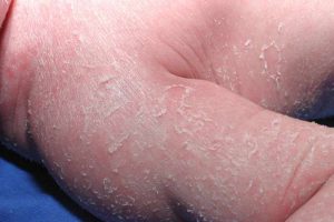 احمرار الجلد الخلقي: يُعرف أيضًا باسم داء السمك مع القصاصات الورقية، وهو موجود منذ الولادة ويظهر على شكل قشور بيضاء دقيقة تغطي الجسم بالكامل.
