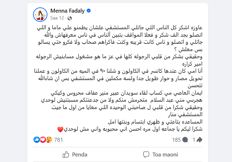 وفي منشور عبر حسابها الشخصي على منصة الفيسبوك، كتبت منة فضالي: “عاوزة أشكر كل الناس اللي جاتلي المستشفى علشان يطمنو على ماما و اللي اتصلو بجد ألف شكر و فعلاً المواقف بتبين آلناس في ناس معرفهاش والله جاتلي واتصلو وناس كانت قريبة وكنت فاكراهم صحاب ولا فكروا حتى يسالو بس معلش”.