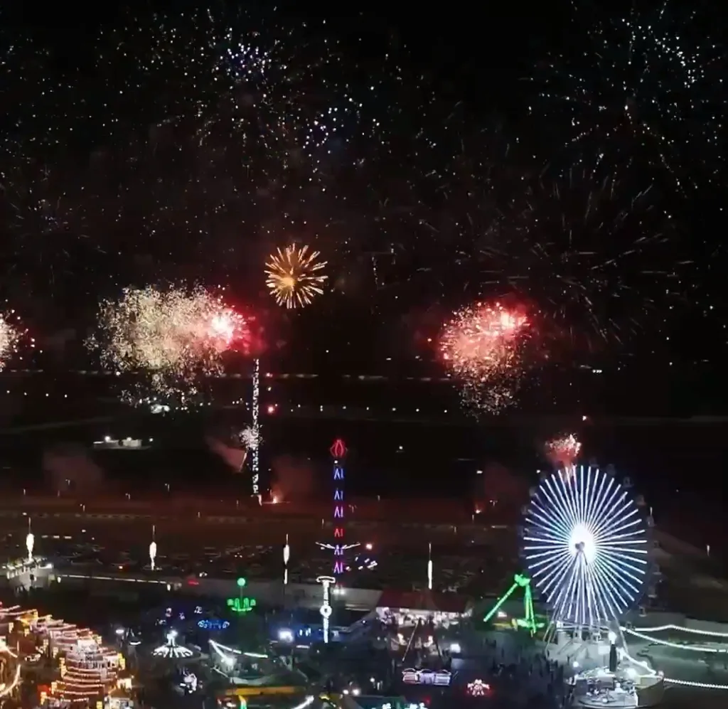 تبدأ احتفالات الألعاب النارية عند الساعة السادسة مساءً وتستمر على رأس كل ساعة حتى منتصف الليل. ومع بداية العام الجديد، ينطلق عرض ضخم للألعاب النارية يستمر لأكثر من 53 دقيقة متواصلة.