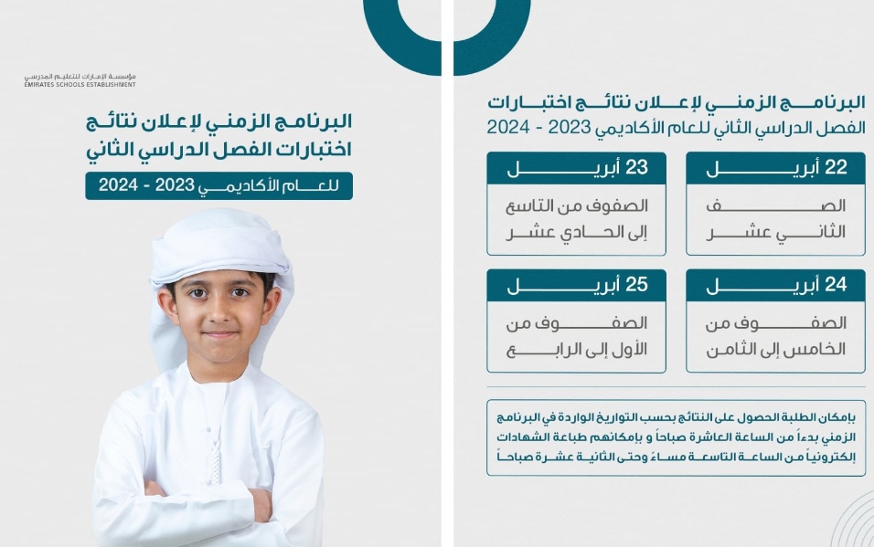 وقالت مؤسسة الإمارات للتعليم المدرسي، إن إعلان نتائج الفصل الدراسي الثاني من العام الأكاديمي 2023 – 2024 لجميع المراحل الدراسية، يبدأ يوم الاثنين 22 أبريل وحتى الخميس 25 أبريل 2024.