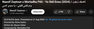 من جهة أخرى، حققت أحدث أغنيات الفنان السوري ناصيف زيتون، والتي حملت عنوان “يا سيدي أنسى”، أكثر من 32 مليون مشاهدة على موقع الفيديوهات الشهيرة يوتيوب، وهي من كلمات مازن ضاهر، ألحان مرتضى فتيتي.