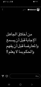 وفي التفاصيل، كتبت هبة نور عبر خاصية الستوري على منصة الانستغرام: “من أخلاق الجاهل الإجابة قبل أن يسمع والمعارضة قبل أن يفهم والحكم بما لا يعلم!!”، ما اعتبره كثيرون ردها على الفنان بسام كوسا.